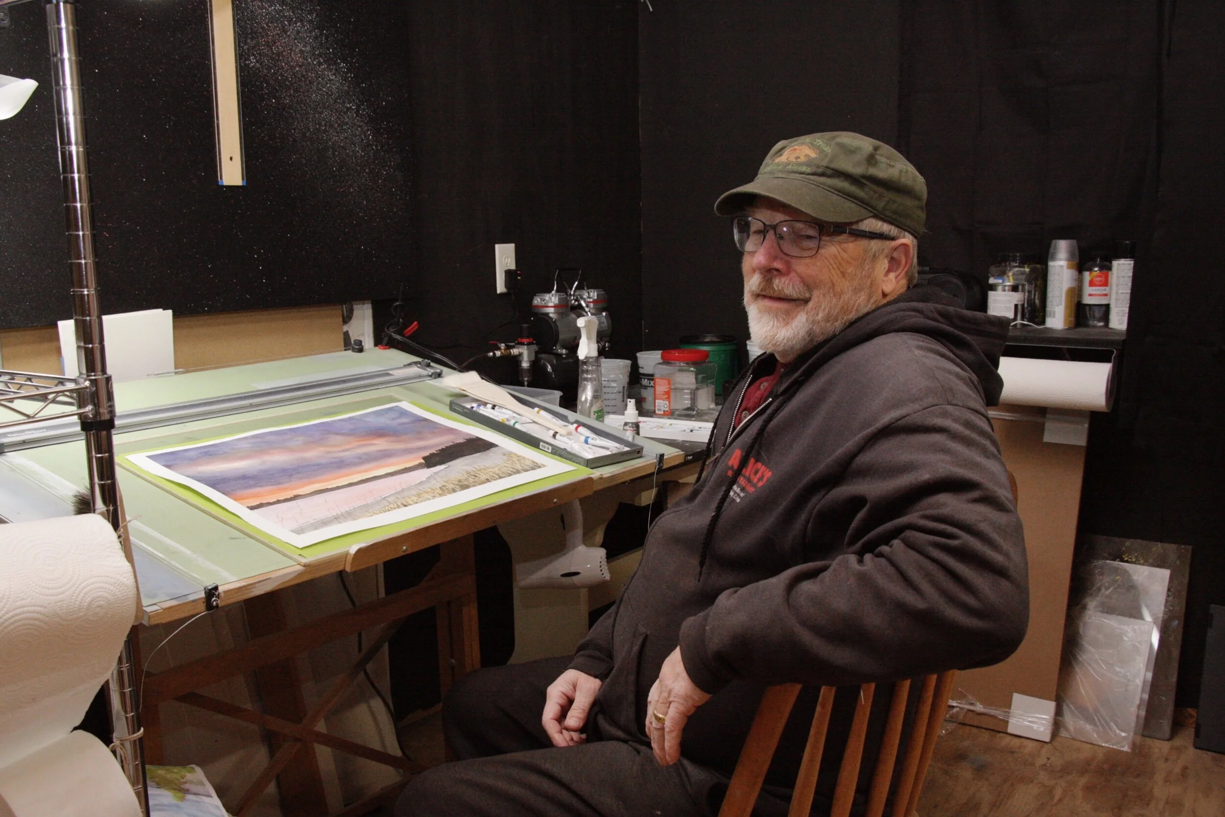 Woody Koning is a long-time resident of Kodiak Island. He came here in his twenties to take a job in commercial salmon fishing and never left. He settled in Chiniak over forty years ago, married Verda and they raised two daughters “off the grid.” Koning fished salmon, halibut, herring and crab which took him around the archipelago. Koning’s fascination with the beauty of the region and it’s amazing inhabitants finds it’s way into his artistic expression. Woody studied art at Foothill College in California prior to arriving on Kodiak Island. His artistic endeavor was distracted as he busied himself with providing for and raising a family off the grid. Heart issues put an end to his fishing career and he pursued work as a contractor and developer. Eventually, Woody’s heart gave way resulting in a heart transplant which forced his retirement. Making art again started out as a therapy and evolved into a serious avocation.